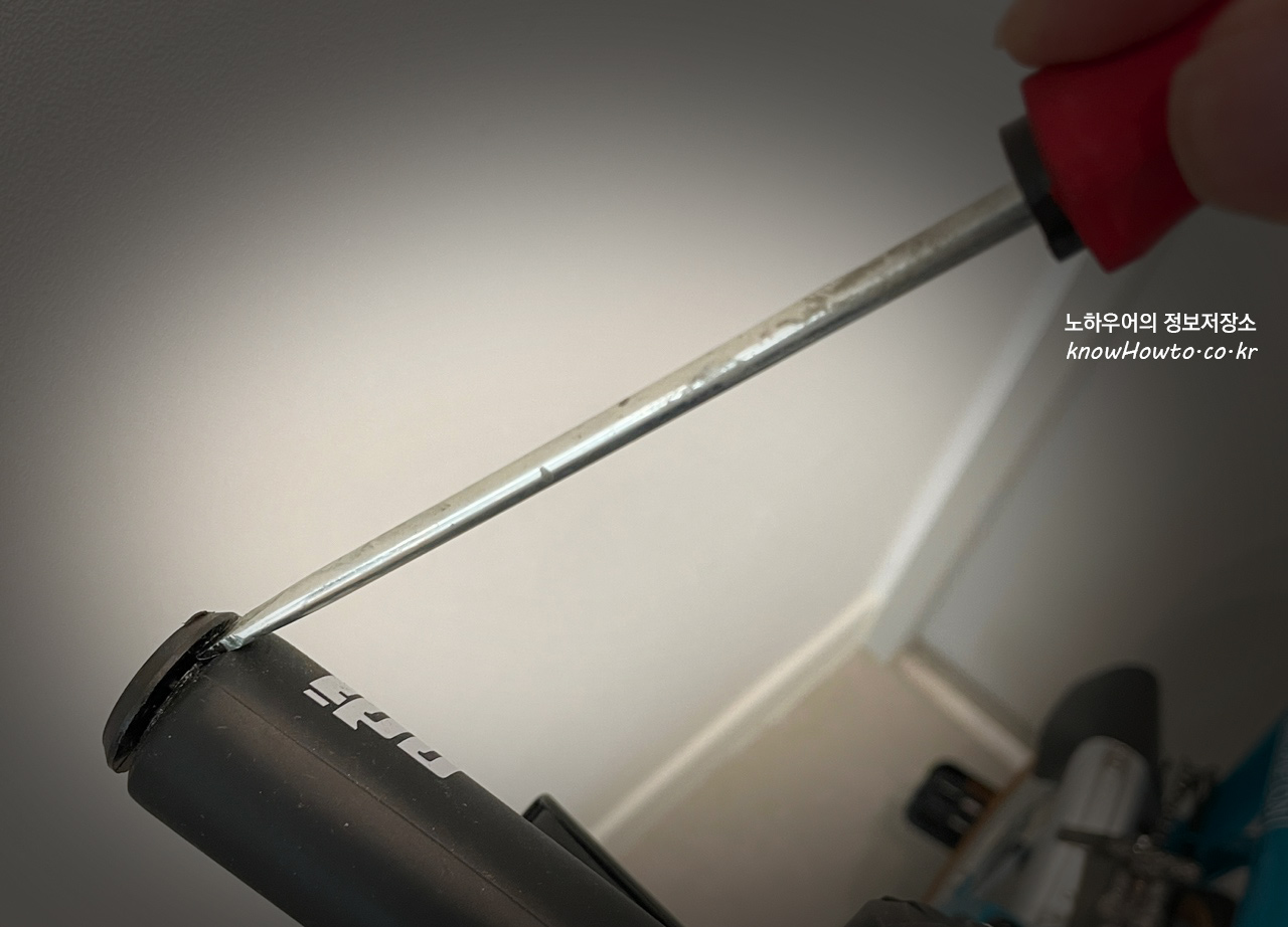 주의하실 점은 칼을 깊이 넣어 자르면 핸들바에 기스가 생기므로 조금씩 자르면서 손으로 벗겨냅니다.