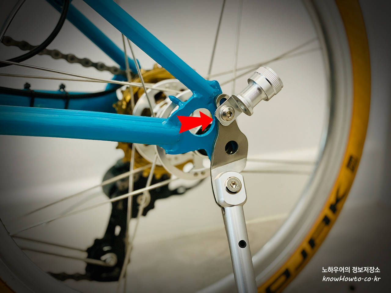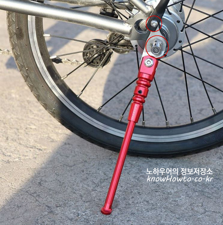 근데 빨간화살표 부위 킥스텐드와 페달거치대까지 함께 달려니 볼트가 짧아서