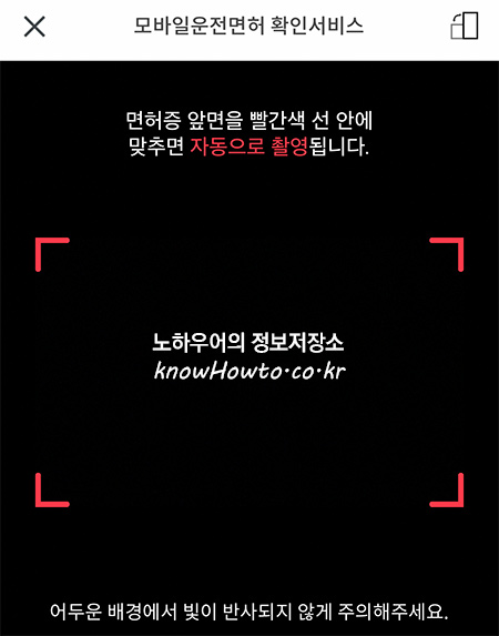 8. 아래와 같이 카메라가 실행되면 빨간 테두리 안에 운전면허증을 위치시키면 됩니다.