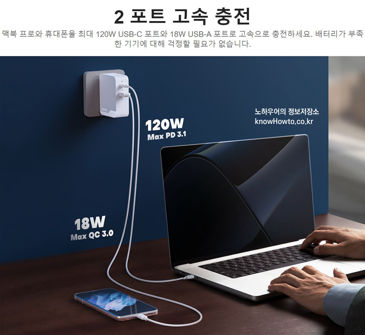 이 때 PD 3.1로 120W 충전과 동시에 QC 3.0 18W 충전이 지원됩니다.