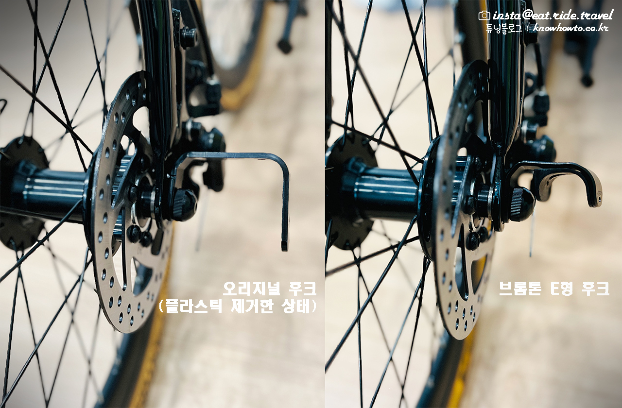 브롬톤이나 파이크, 식스티는 모두 리어랙을 제거하면 E형후크를 달면 쉽게 해결이 되는데