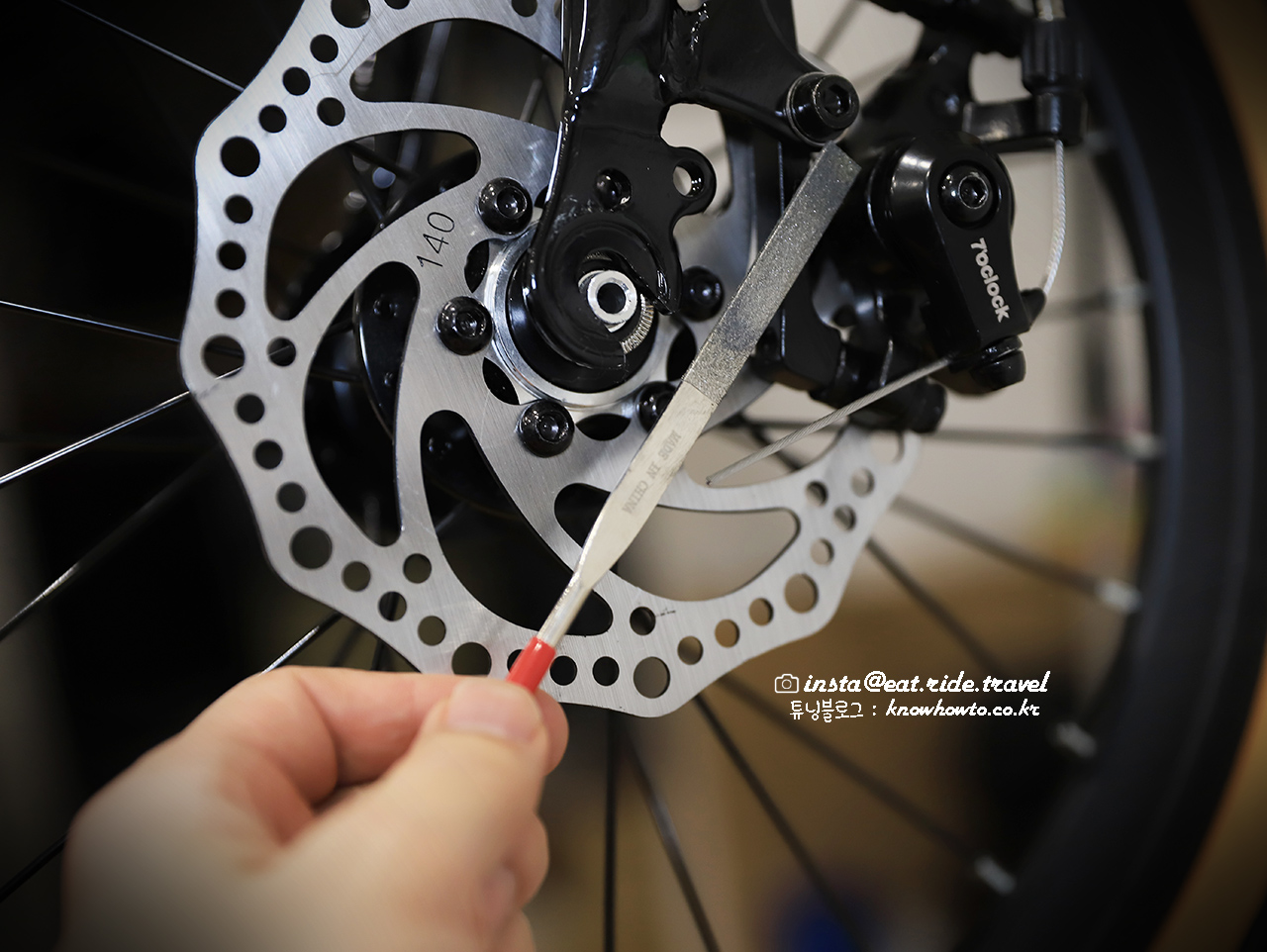 휠이 약 1-2mm 차이로 안들어가는 상황이기 때문에, 디스크브레이크를 센터에서 1-2mm만 띄워주면 됩니다.
