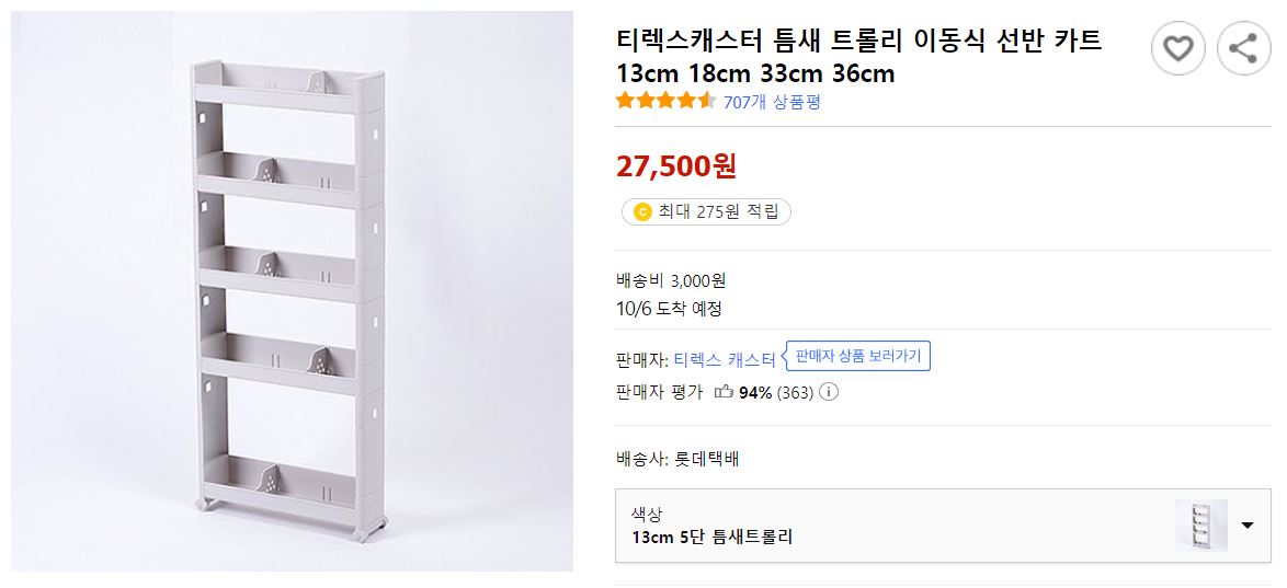 제가 구매한 제품은 바로! 아래 폭 13cm 짜리 틈새 선반입니다.
