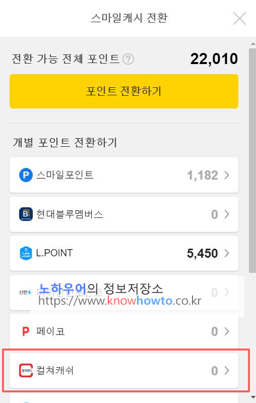 3. 전환 가능한 포인트 목록을 확인하고 그 중 특히 '컬쳐캐쉬'를 클릭합니다.