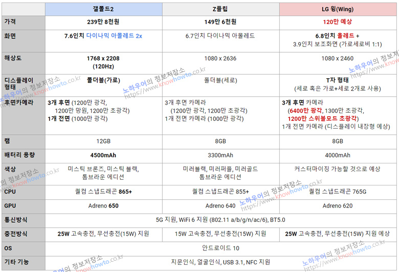 위에 LG윙 스펙 비교표에서 보실 수 있는데