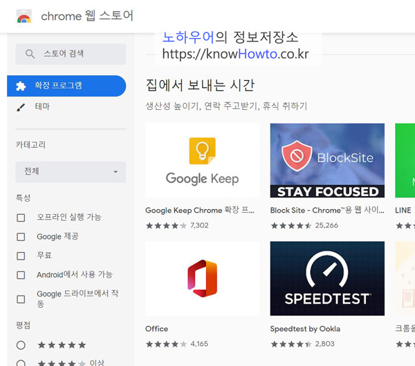 URL 입력창에 chrome.google.com/webstore/category/extensions?hl=ko&를 입력하고 접속하셔도 됩니다.