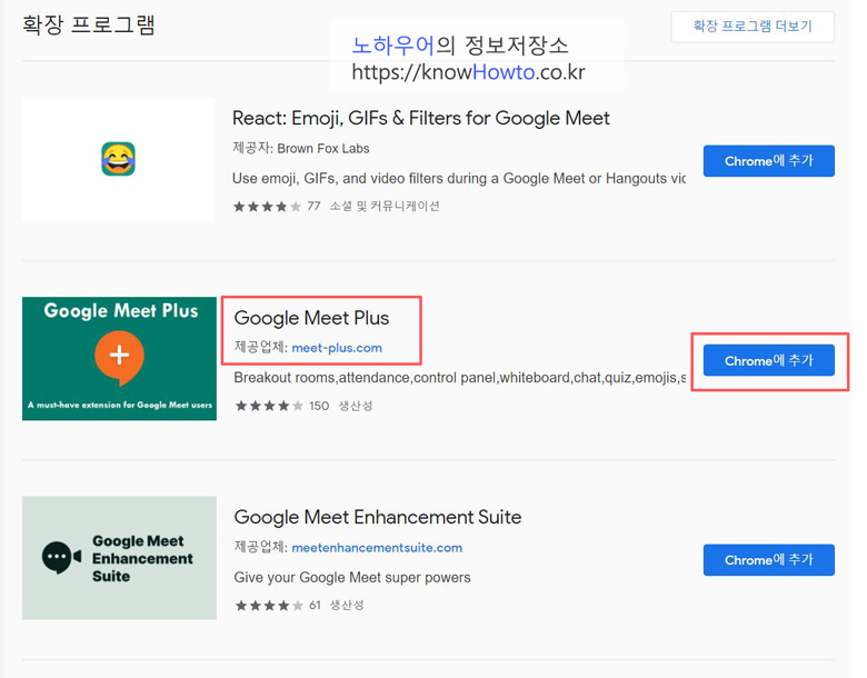 여기서 'Google Meet Plus' 옆의 'Chrome에 추가'를 클릭합니다.