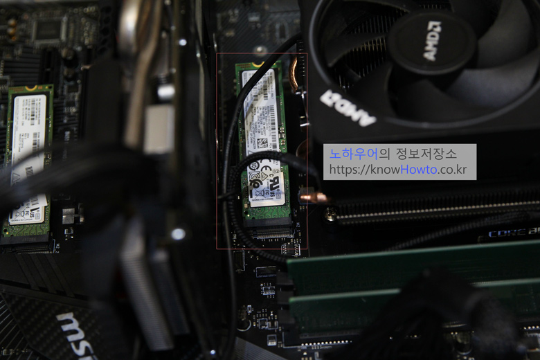 좌측에 보시면 M.2 2번슬롯이 있고 다른 NVMe 타입의 SSD가 설치되어 있는 것도 보실 수 있습니다.