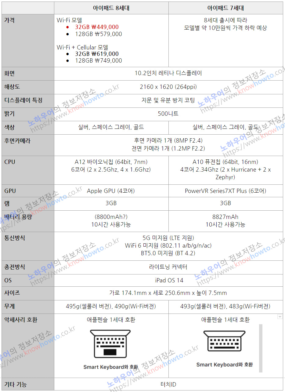 아이패드 8세대 상세스펙과 아이패드 7세대 스펙을 비교했습니다.