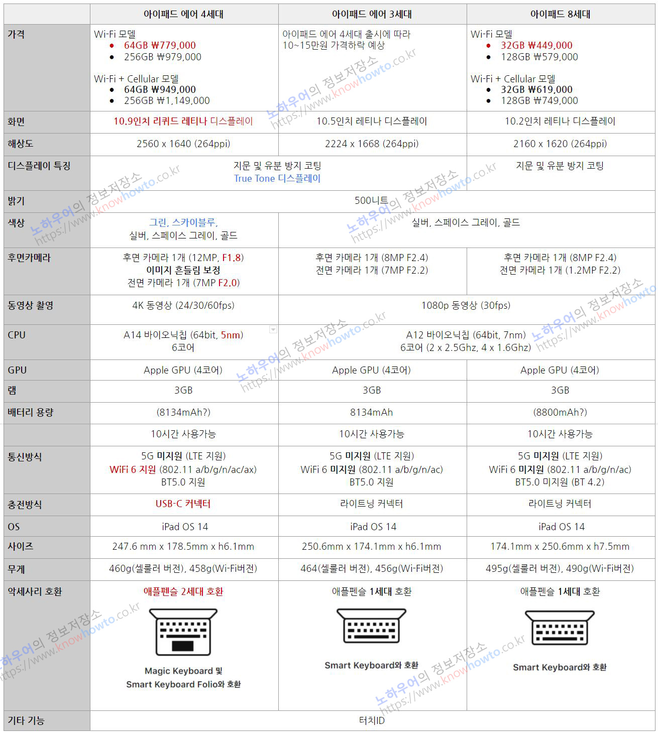 아이패드 에어 4세대 상세스펙과 아이패드 에어 3세대, 아이패드 8세대 스펙을 한눈에 비교했습니다!