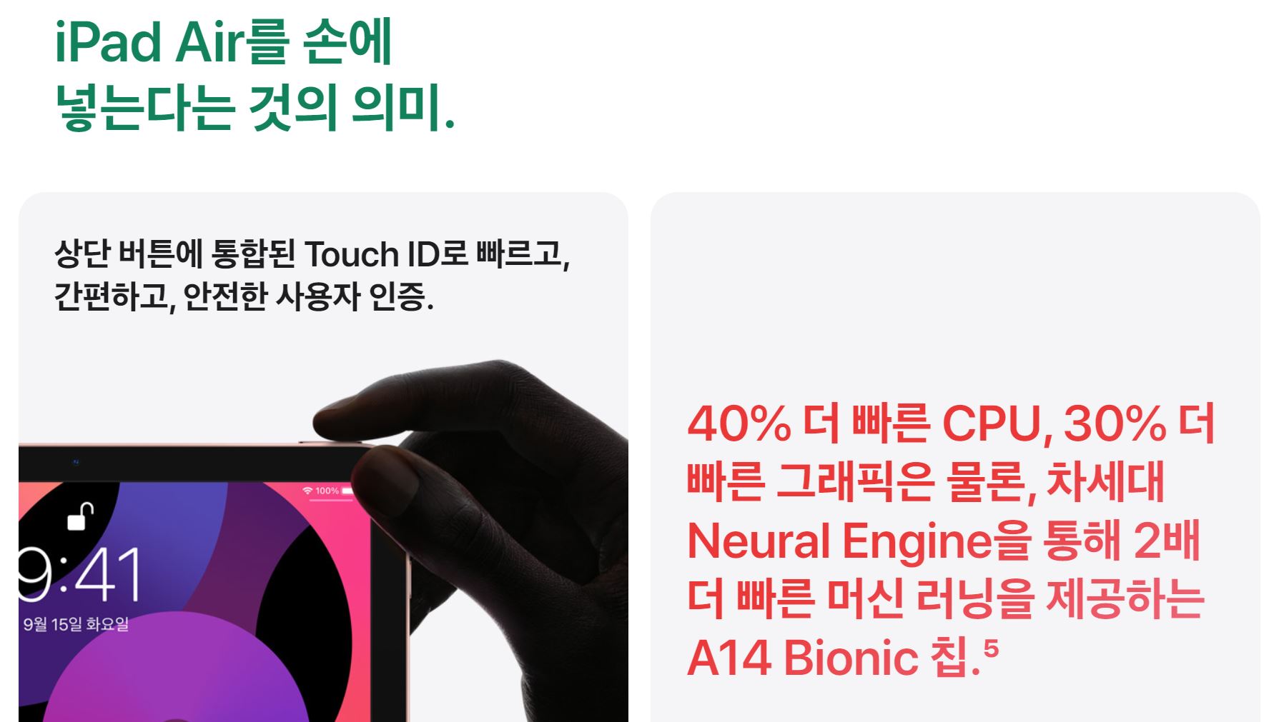 GPU는 새로워진 Apple GPU를 사용하며 아이패드 에어3 대비 30% 향상되었습니다.