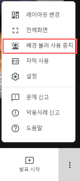 '배경 블러'를 사용 중이라면 아래와 같이 '배경 블러 사용 중지' 옵션이 표시됩니다.