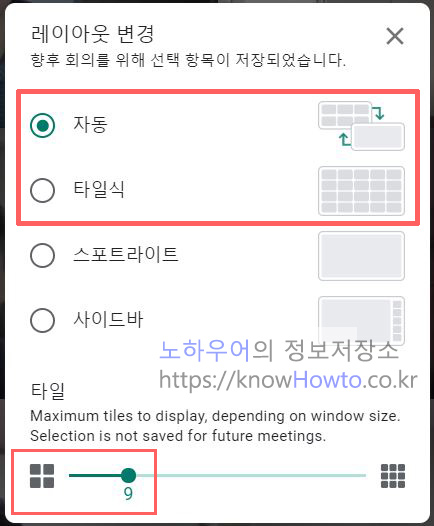 여기서 '자동'이나 '타일식'을 선택하는 것을 일반적인 회의에서는 추천드립니다.