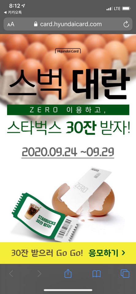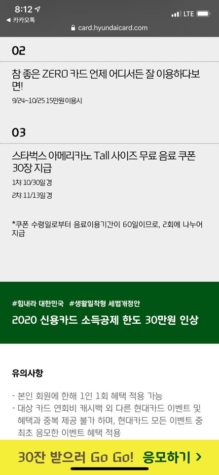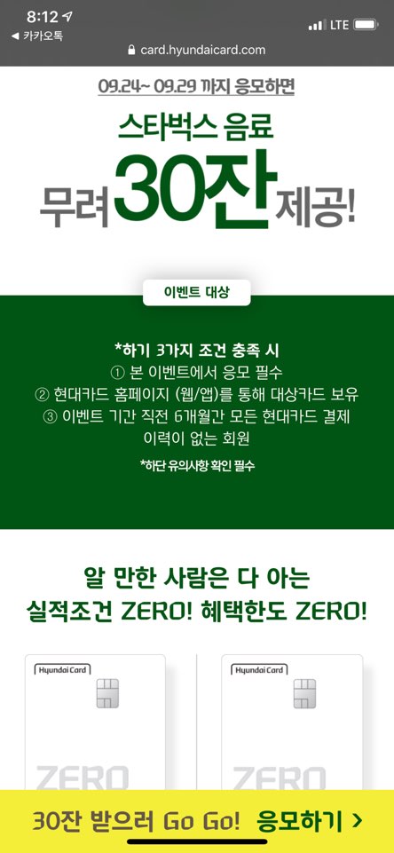 위와 같이 현대카드 제로2를 발급하면 스타벅스 기프티콘 30장을 주는 이벤트입니다.