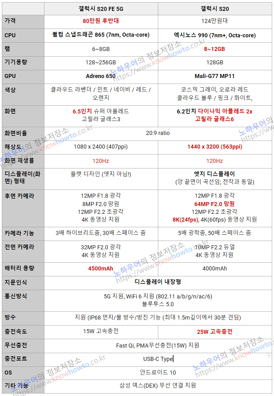 메모리는 갤럭시 갤럭시 S20는 8~12GB이고 갤럭시S20 FE는 6~8GB인데