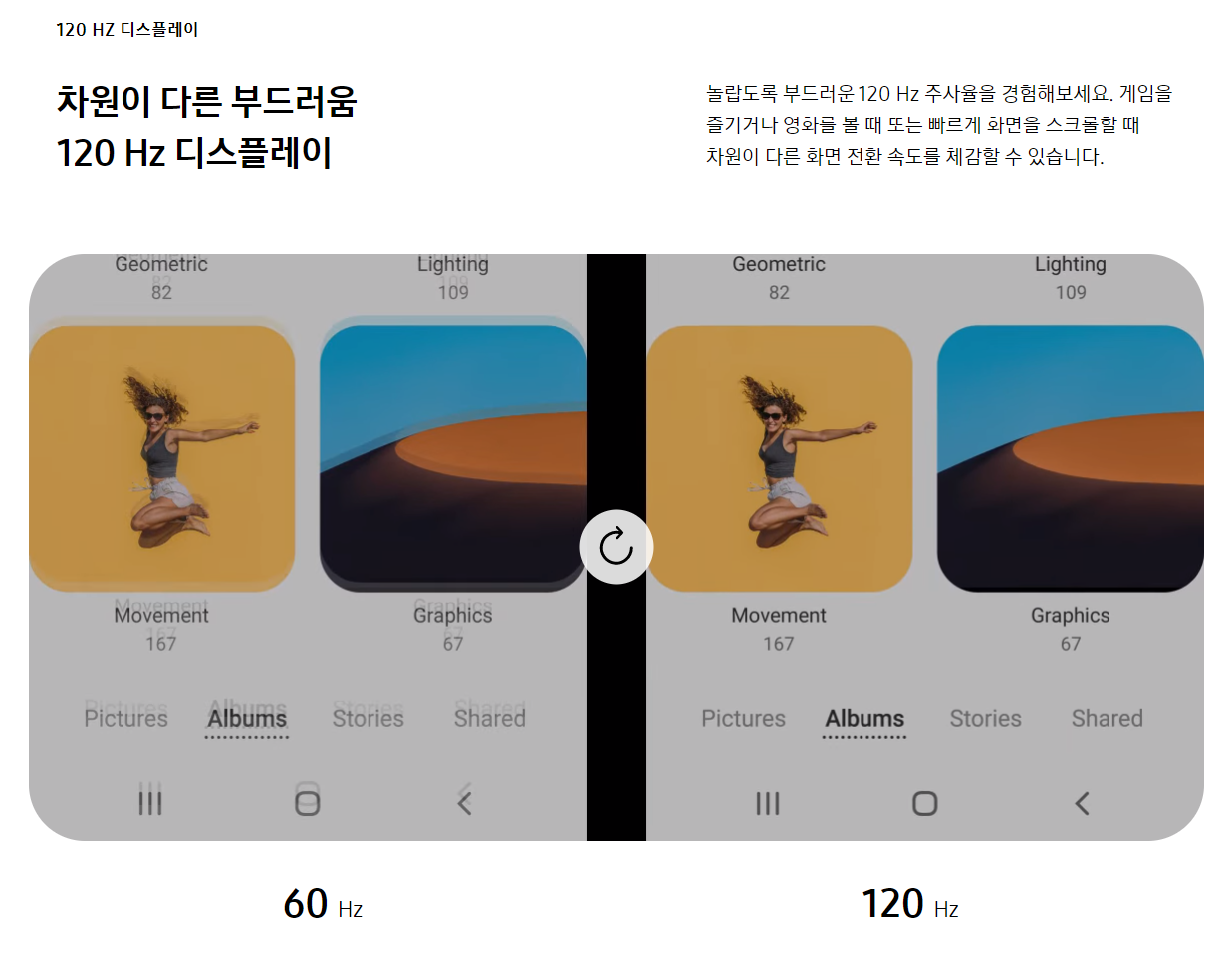 화면 주사율은 모두 120Hz로 웬만한 휴대폰에서 제공하는 60Hz의 2배입니다.