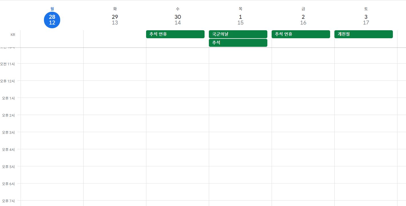 5. 아래는 보조캘린더 '한국'이 적용된 주 단위 화면입니다.