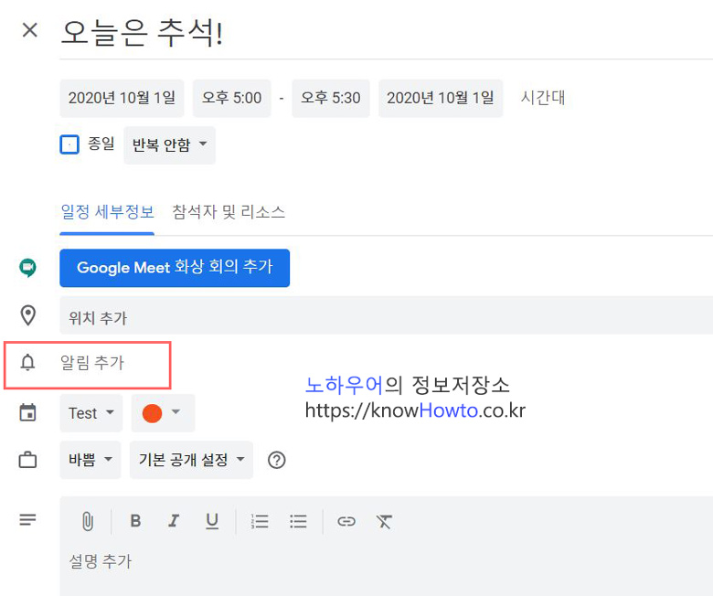 3. 아래와 같은 수정화면 (혹은 신규 일정 생성 화면)에서 알림이 있을 것입니다.