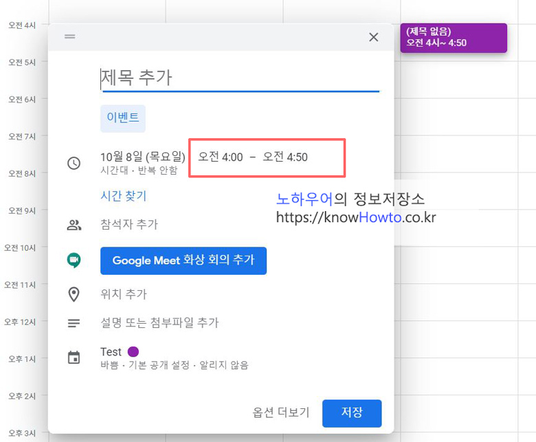 4시에 일정을 생성하려고 할 때 기본적으로 4시 ~ 4:50으로 설정되는 것을 볼 수 있습니다.