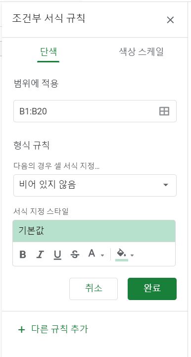 초기값은 셀이 '비어있지 않음'이면 '녹색'배경을 지정한다 입니다.