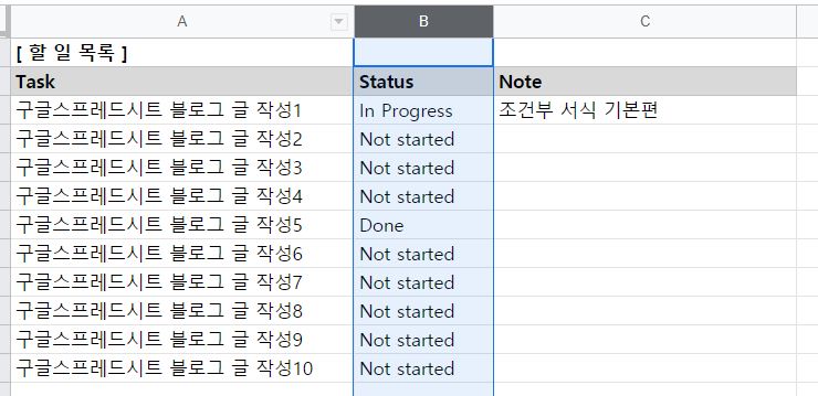 조건부 서식 예시를 보이기 위해 간단하게 To do 리스트를 아래와 같이 작성해 보았습니다.