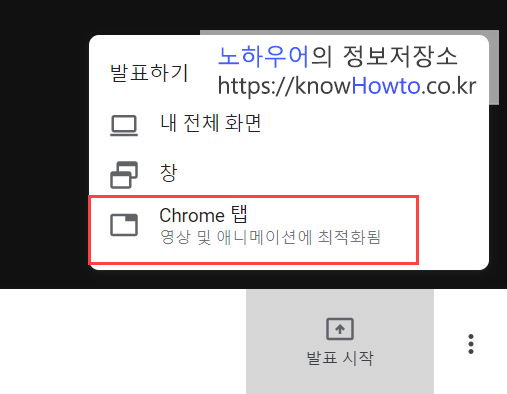 구글미트 우측 하단의 '발표 시작' 버튼을 클릭하고, 'Chrome 탭'을 선택합니다.