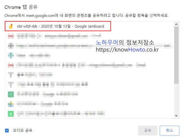 공유는 가능하면 항상 '크롬 탭'을 공유하여 한 탭만 다른 사람들에게 보여지도록 하는 것이 좋습니다.