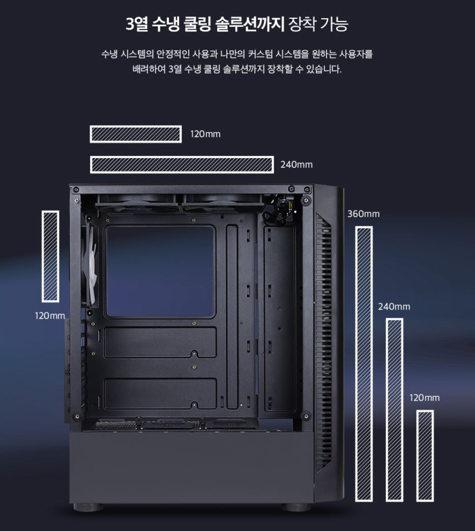 상단 2개 팬(120mm)까지 달려있어 더 이상 케이스 팬을 설치할 필요가 없습니다.