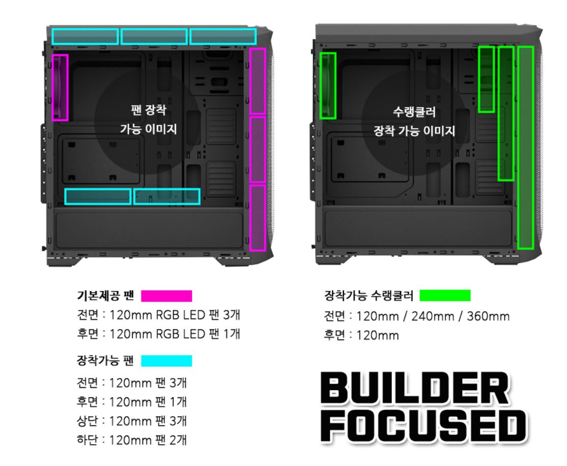 추가 팬을 구매하여 하단 2개, 상단 3개를 추가 장착 가능합니다.
