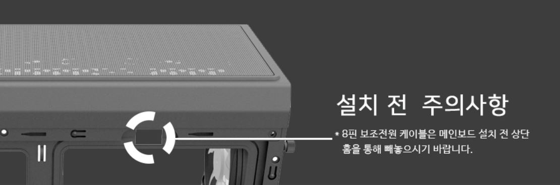 위에 보이는 구멍으로 8핀 보조전원 케이블을 메인보드 설치 전!!! 빼놓아야 합니다.
