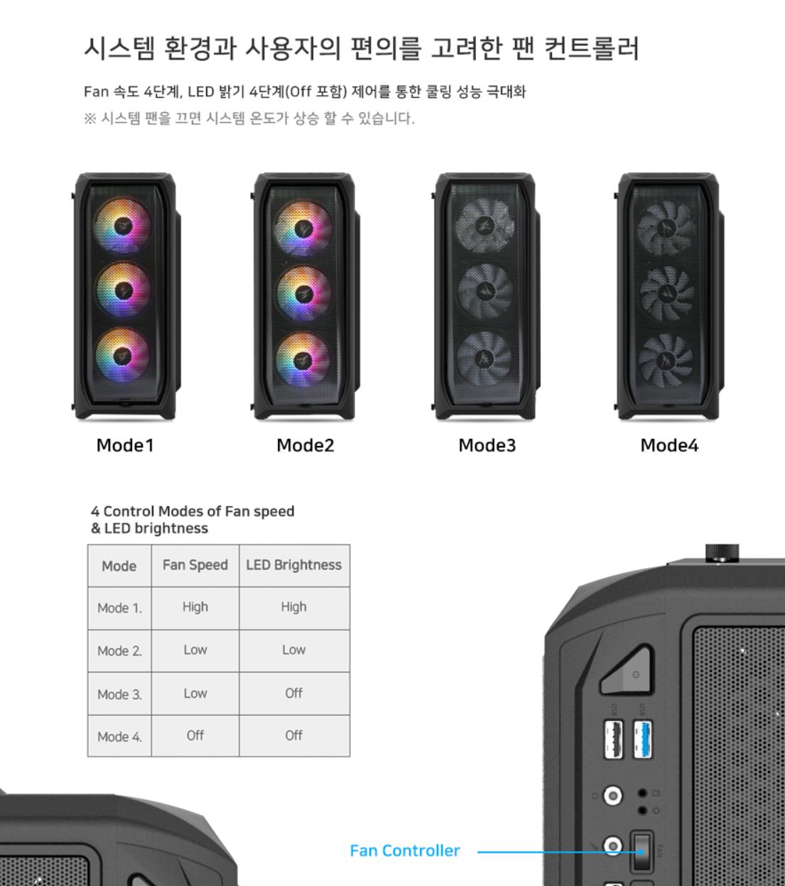 잘만 N5 MF케이스는 FAN 속도 조절을 지원합니다. 상세내용은 아래 그림에서 참고 가능합니다.